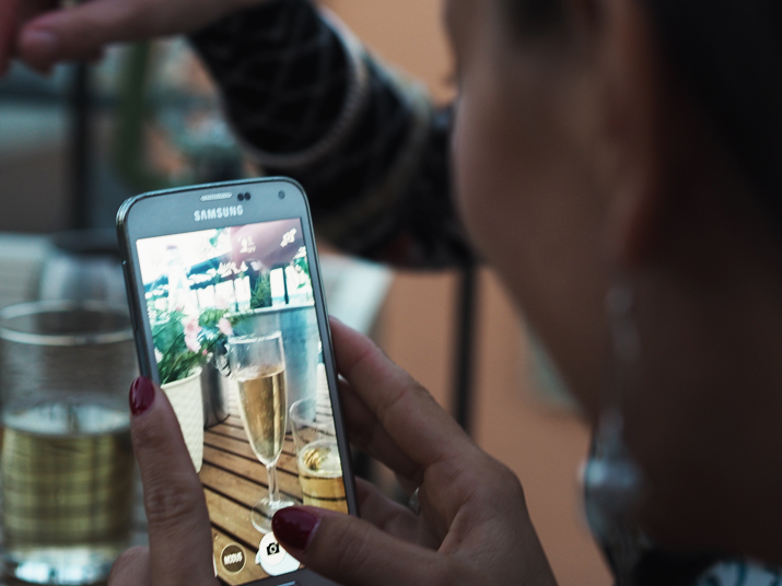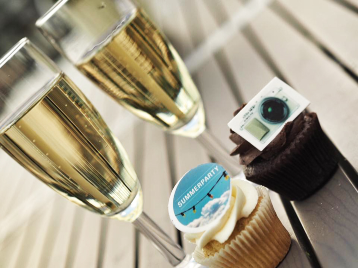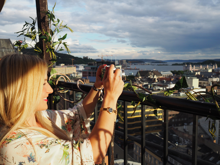 Čeká nás sprcha blesků a prodíráme se do welcome místnosti. Tam je už akce v plném proudu. Je tam několik křesel, kde dámy nechávají profesionálně nalíčit, aby se mohly stydlivě usmát do blesku známého norského fotografa Krisstoffera Myhre. Je tam pěkný šrumec a fotografie se tisknou ostošest. My se sem chystáme v průběhu večera vrátit a teď vyrážíme o patro výš. Někdo nám do ruky vtiskne sklenku Cavy a tu už nepustím. A někdo další mi do ní pořád nenápadně přilejvá. Kocháme se nádherným výhledem na Oslo a Oslo fjord, jíme marcipánový foťák, který zdobí minicupcake a pozorujeme, jestli zahlédneme někoho, koho třeba jen trochu virtuálně známe.