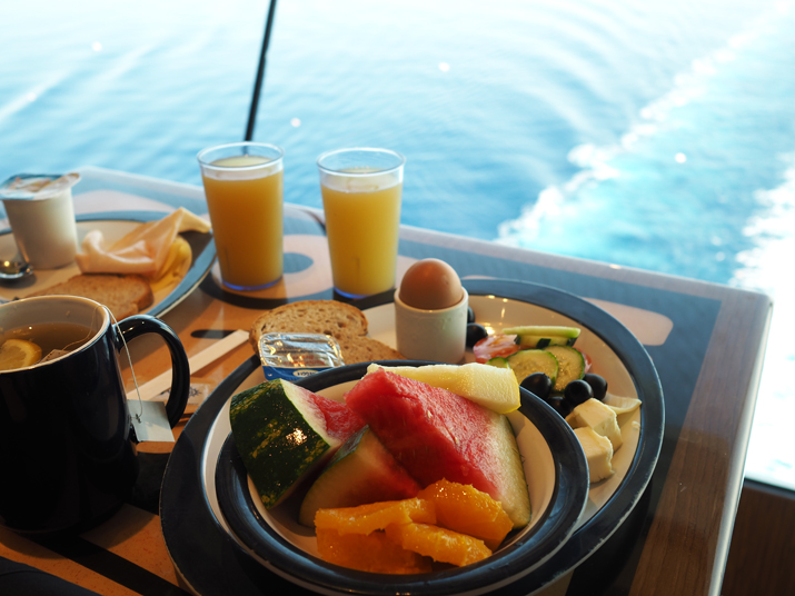 Loď se pomalu vznáší na modré nádheře a my snídáme. Projít