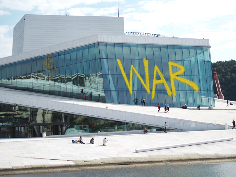 Procházím kolem norské Opery, na které je obrovský nápis WAR. Byla jsem zvědavá, jak bude vypadat ve skutečnosti. Jestli se pod fousama rozčilujete, co to bylo za blbce, tak vás zastavím. Není to totiž vandalství, ale pravda, trochu šokující, reklama na nové představení. Přes noc se nápis objevil na Opeře a rozbouřil celé Norsko. Pár hodin na to do médií vystoupil ředitel Opery Per Boyen Hansen a jednou větou přetočil význam o sto osmdesát stupňů – je to reklama na novou hru «War Requiem».