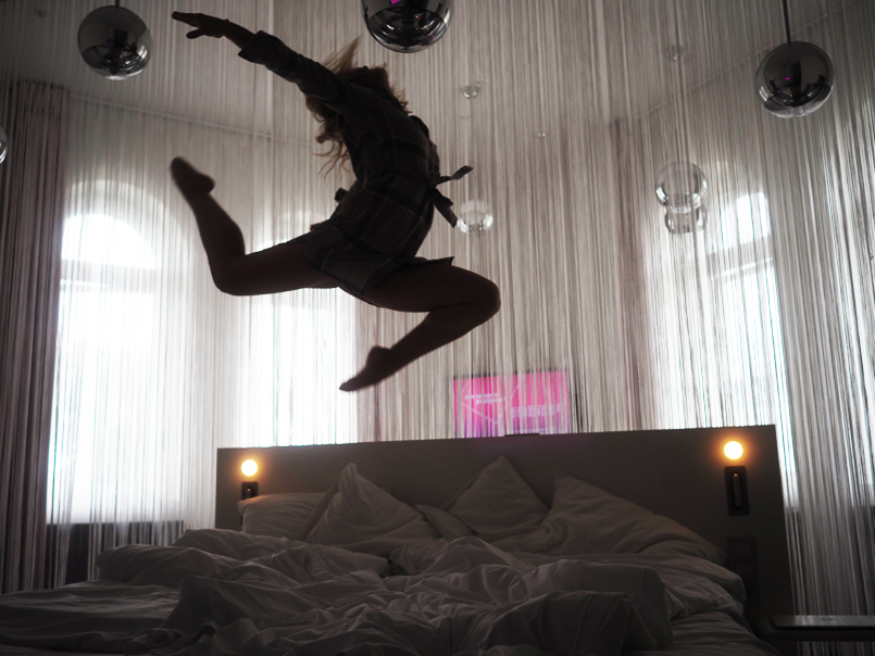 Vracím se do pokoje a řádím tam jako malá. Prej se to může. Podle mě je to totiž pokoj pro blogerský princezny a v něm se může (skoro) všechno. Skákat po posteli, lézt na okna, motat se do provázků a procházet se po hraně postele jako malá nervózní gymnastka na závodech.
